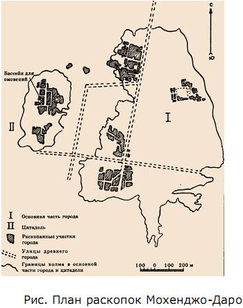 В своей книге «Аксиомы истории. Анализ географии древности», я приводил фрагмент, имеющий отношение к Вавилону: «Реки Тигр и Евфрат текут посреди Месопотамии и Вавилонии и впадают в Нил. Рассказывают, что эти реки мелеют, когда Нил затопляет Египет; когда же он вновь входит в русло, то и эти реки становятся полноводными…». (Эккерхард из Ауры, Вюрцбургская хроника, [25]). Тогда я предположил, что этот фрагмент можно объяснить большим количеством дубликатов в названиях одних и тех же географических объектов. Но когда пришло понимание, где находился Египет, о котором пишет Геродот, стало ясно, что непонимание этого фрагмента связано с неправильной локализацией Египта и Нила, названия, которых были привязаны ошибочно к нынешнему Египту. Если Нил Геродота это нынешний Инд, то понять, где находится Месопотамия (Междуречье) совсем не сложно, достаточно на карте найти место, где в Инд впадают несколько крупных рек. Это место ― знаменитый Пенджаб, Пятиречье. Этот фрагмент противоречит предположению, что Евфрат это река Сарасвати, но не противоречит нахождению Евфрата на северо-западе Индии. Интересно рассмотреть описание Вавилона у Геродота и сравнить это описание с развалинами древнего города Мохенджо-Даро. Ниже приведены развалины этого города из «Википедии» и план раскопок из работы: «История Древнего мира. Древний Восток. Индия, Китай, страны Восточной Азии», [17]