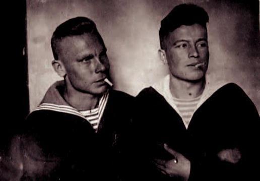 На казарменном положении нас держали целый месяц, делали хотя бы внешне похожими на военных людей. После «обкатки» нам выдали черные суконные брюки, темно-синие суконные рубашки-форменки, хромовые ботинки, ленточки на бескозырки и по выходным дням стали отпускать в город. Это называлось увольнением на берег. Иди, куда хочешь! А куда? Первым делом пошли в Петергофский парк и сфотографировались у фонтана «Ева», чтобы послать фотографию домой. На втором снимке крупным планом мы с Колей Бобковым.