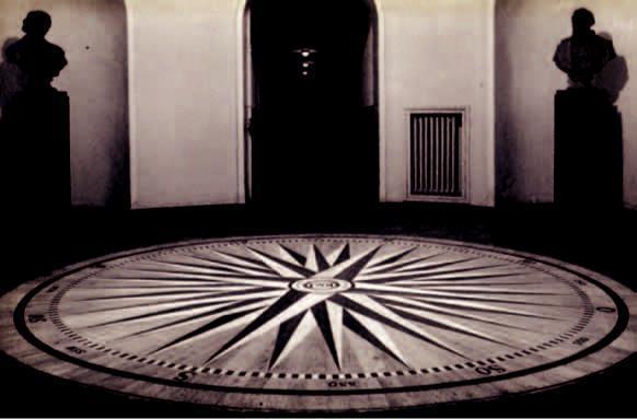 Картушка разделена на 32 равные части – румбы. Ось классного коридора не совпадает с истинным меридианом, обозначенным на картушке. Причину этого знают далеко не все. При планировании Петербурга Петр I рассчитывал вместо улиц – линий Васильевского острова, прорыть каналы по направлению север–юг, то есть по меридиану. Каналы вырыть не успели. Улицы – линии – проложили по указанному Петром плану и направлению. Планировка производилась по буссоли, указывающей направление магнитного меридиана. В 1861 году в круглом зале установили картушку по истинному меридиану, и оказалось, что ось классного коридора отклонена приблизительно на два румба от направления юг–север. В Морском корпусе Компасный зал был вроде лобного места. Здесь на виду у всех ставили в наказание провинившихся кадетов. Иногда они занимали чуть ли не все румбы картушки.