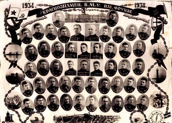 Третий выпуск штурманов-подводников ВМУ им. М. В. Фрунзе. 1938 г. Г. К. Васильев в третьем ряду снизу, третий слева