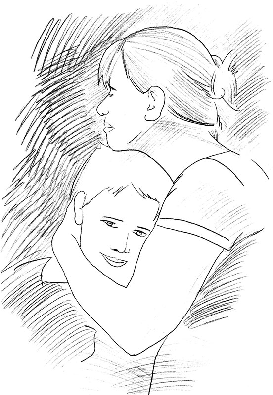 Мать брала Мишку за руку, и они шли дальше, вдохновленные близостью деревни. Но сынишка уж слишком устал. Увидев на дороге сухую сосновую ветку, мать подняла ее, укоротила, обломала сучья и подала Мишке.
