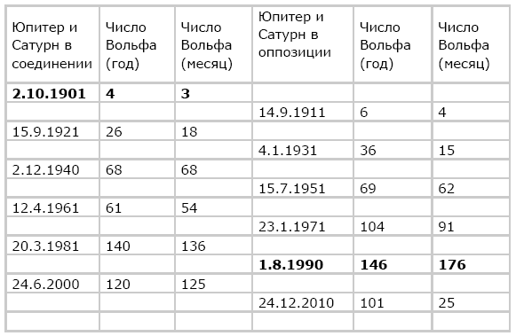 Если даже Луна способна изменить поведение масс людей, то какое действие способны оказать планеты-гиганты, вставшие в соединение? Событие не частое, но за время соединения Юпитера и Сатурна Земля успевает в некоторые десятилетия несколько раз встать как на одну линию с ними, так и между данными планетами-гигантами и Солнцем. Что происходило на Земле в годы таких соединений: 1901, 1921, 1940, 1961, 1981, 2000. Необходимо учитывать, что центры масс Солнечной системы и Солнца не совпадают в это время в наибольшей степени, что ведёт к необычным гравитационно-магнитным и иным изменениям. Это связано с наличием в нашей крови дополнительной порции гормонов в этот период. Это годы предрасположенности людей к активным действиям, приподнятости духа, бурного развития экономики.