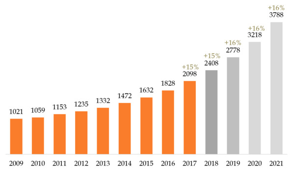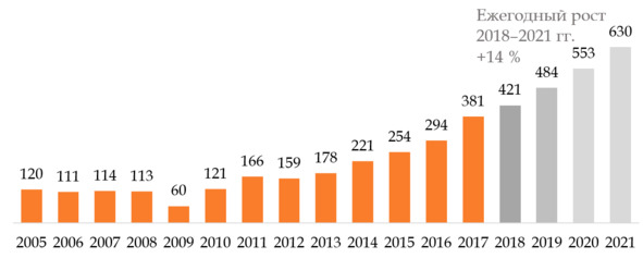 В 2017 году в мире было продано 381 тыс. промышленных роботов, что на 30% больше, чем в 2016 году (рис. 1). По прогнозу IFR, к 2021 году ежегодные продажи робототехнических устройств составят 630 тыс. штук.