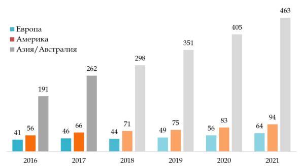 Лидером по объему продаж промышленных роботов является Азиатско-Тихоокеанский регион (рис. 3). По сравнению с 2016 годом продажи здесь выросли на 37% и составили 262 тыс. штук. Тенденция сохранится в ближайшие три года, и к 2021 году количество поставляемых в Азию и Австралию роботов достигнет 463 тыс. единиц. Стабильно высокие показатели региона обеспечивает главным образом китайский рынок – крупнейший мировой потребитель в области промышленной робототехники. В Китае проводится последовательная государственная политика по развитию робототехники, повышается уровень автоматизации производства, что стимулирует спрос на робототехнические решения.