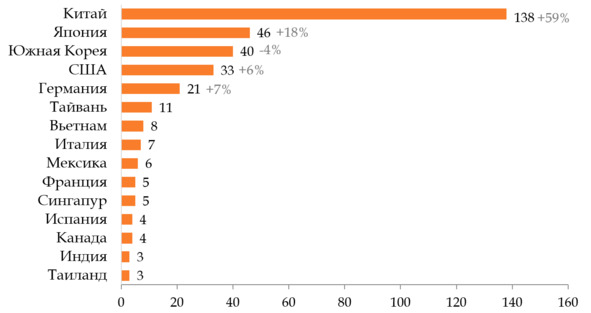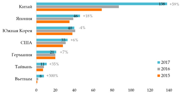 Рассматривая продажи промышленной робототехники в ракурсе отдельных стран мира, можно отчетливо выделить ведущую пятерку, в которую входят Китай, Япония, Южная Корея, США и Германия. На их долю в 2017 году пришлось 73% всех продаж сегмента. На 6-м и 7-м местах находятся Тайвань (11 тыс. шт.) и Вьетнам (8 тыс. шт.) (рис. 4).