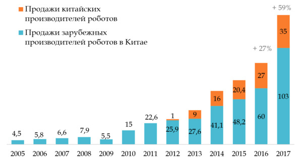 Спрос на импортируемую робототехнику в Китае повышается: в 2017 году продажи зарубежной продукции увеличились здесь на 72% и составили 103 200 штук. В это число входят также роботы, созданные иностранными партнерами на предприятиях, расположенных в пределах Китая. Отметим, что впервые динамика роста продаж зарубежных промышленных манипуляторов превысила аналогичный показатель местных производителей: китайские компании продали всего на 25% больше роботов по сравнению с 2016 годом, что составило 35 тыс. единиц.