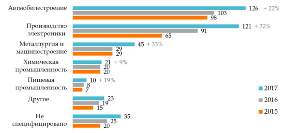 Основными отраслями, для которых в 2017 году поставлялись промышленные роботы, являются автомобилестроение, производство электроники, металлургия и машиностроение, химическая и пищевая промышленность (рис. 8).