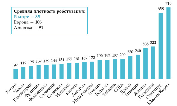 В 2017 году среднемировая плотность роботизации в промышленности составила 85 роботов на 10 тыс. рабочих, что является новым мировым рекордом (в 2016 году – 74 робота на 10 тыс. рабочих).