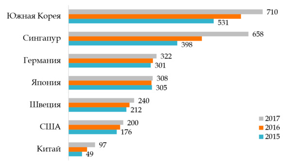 В Южной Корее отмечен самый высокий уровень роботизации в мире – 710 роботов. В 2016 году это показатель составлял 631 робот на 10 тыс. рабочих, в 2015-м – 531. Позицию лидера страна удерживает с 2010 года благодаря высокому уровню автоматизации в производстве электроники и автомобилестроении.