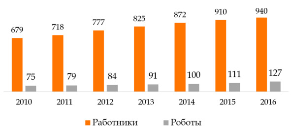 В российском сегменте промышленной робототехники продажи пока крайне низкие. За 2017 год в стране было продано 713 роботов (рис. 23). Объем рынка промышленных роботов составил 2 млрд руб., а сектор робототехнических систем достиг 5,8 млрд руб. На долю РФ в отчетный период пришлось лишь 0,18% от мирового объема продаж. Столь малый размер рынка является причиной нерентабельности производства промышленных роботов в России.
