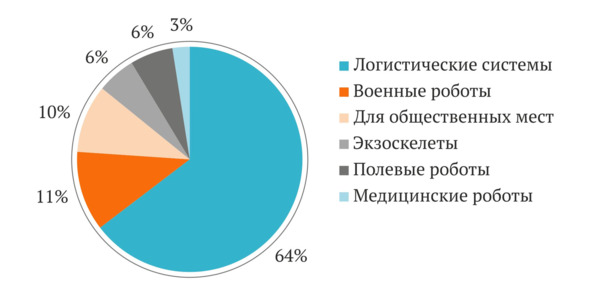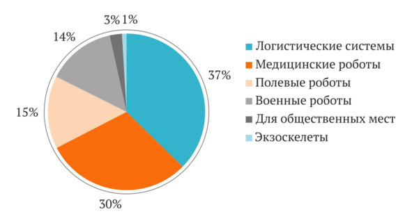 Наибольшие доли объема рынка профессиональной сервисной робототехники в 2017 году составили логистические системы ($2,4 млрд) и медицинские роботы ($2 млрд). Далее следуют полевые роботы ($0,96 млрд), военные роботы ($0,9 млрд), роботы для работы в общественных местах ($0,2 млрд) и экзоскелеты ($0,05 млрд).