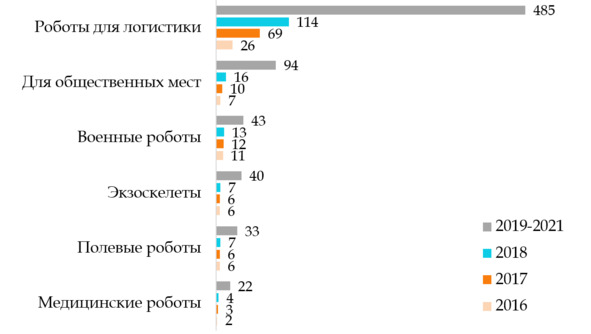 В области профессиональной робототехники наилучшим образом будут развиваться ниши логистических систем и роботов для работы в общественных местах. Также положительную динамику продемонстрирует сегмент медицинских роботов, прежде всего роботы-хирурги и роботы для реабилитации.