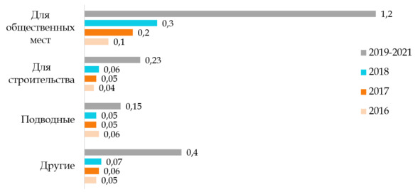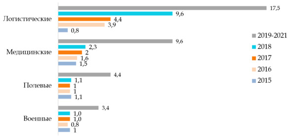 Рынок сервисных роботов для профессионального использования вырос на 39% в 2017 году по сравнению с показателями прошлого года и составил $6,6 млрд (рис. 12). По прогнозу IFR, за 2019—2021 годы объем сегмента совокупно увеличится на $46 млрд, преимущественно за счет выпуска роботов для логистики, медицинских и полевых роботов.