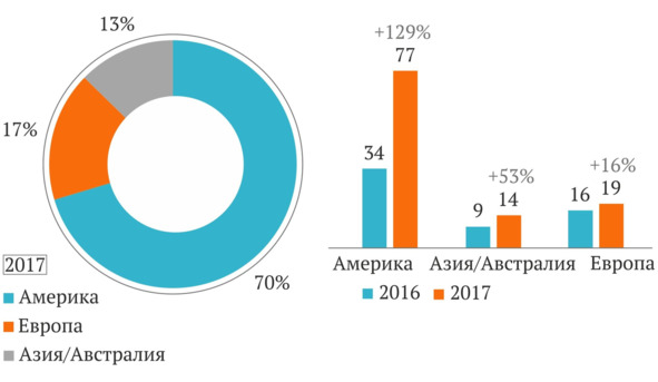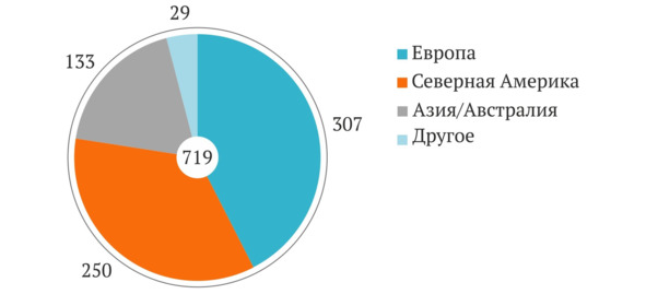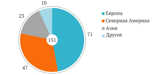 Вторую позицию занимает Северная Америка, на долю которой приходится 250 компаний.
