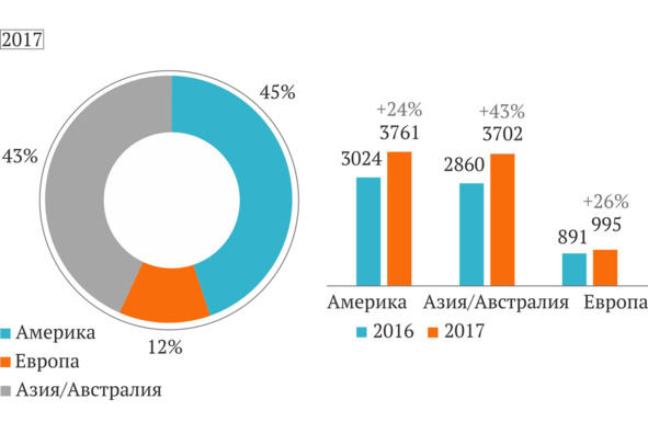 Продажи профессиональных сервисных роботов европейского производства увеличились всего на 16%, тогда как азиатско-австралийский регион показал прирост более чем вполовину (53%), а Америка продемонстрировала скачок в 129% в 2017 году по сравнению с уровнем предыдущего года (рис. 21).