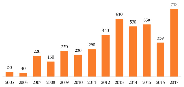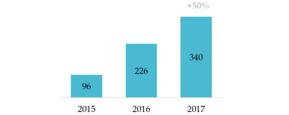Сбором данных о рынке сервисной робототехники занимается Национальная Ассоциация участников рынка робототехники. Информацию о своей деятельности предоставляют десять компаний. Динамика продаж в области сервисной робототехники показывает ежегодный прирост на 50%. В 2017 году совокупный объем продаж десяти предприятий сервисной робототехники составил 340 млн руб. (рис. 29).