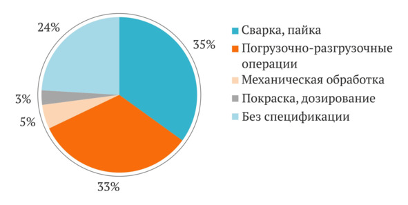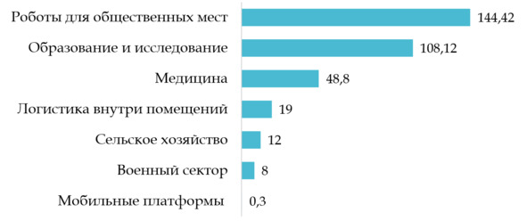 По данным опроса НАУРР десяти компаний, наибольшую долю рынка (42%) занимают компании, разрабатывающие роботов для функционирования в общественных местах. На втором месте – роботы для образовательных целей (32%), за ними следуют роботы для медицинских целей, логистических задач, сельского хозяйства, специального назначения.
