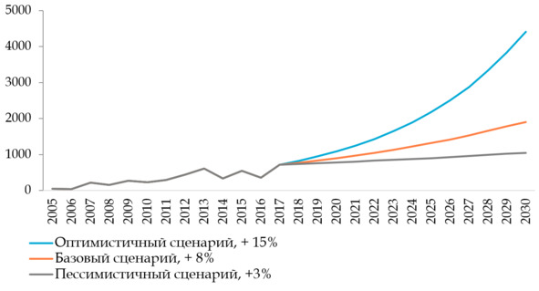 – рост рынка от 15% ежегодно. Перспективы более активного развития отрасли открываются в условиях стабильной экономической ситуации с популяризацией робототехнических решений и принятием мер по стимулированию спроса на продукцию. Также благотворное влияние на увеличение рынка окажет упрощение взаимодействия с РТК для конечного потребителя. Одним из способов может стать внедрение передового программного обеспечения и сервисной модели использования робототехники, что сделает ее доступной на средне- и мелкосерийном производстве. В данном сценарии в России к 2030 году будет устанавливаться около 4 500 роботов. Оптимистический сценарий