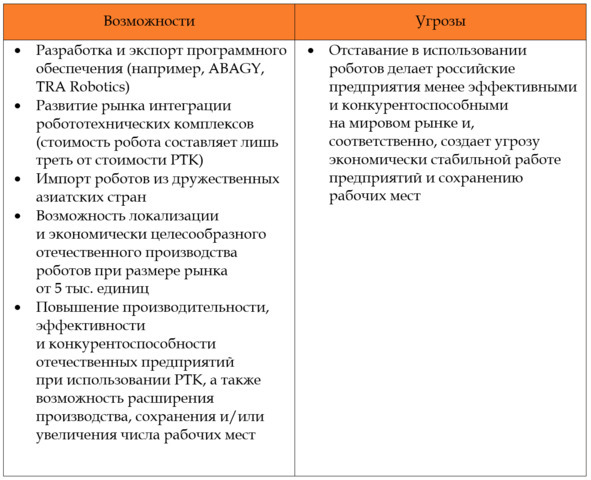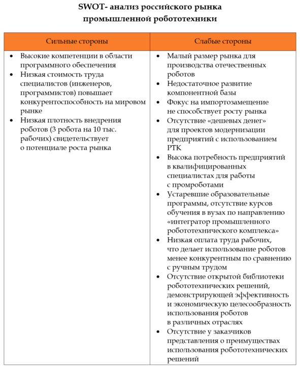 На основании данных, собранных НАУРР о российском рынке промышленной робототехники, был проведен SWOT-анализ данного сегмента рынка. Были выделены сильные и слабые стороны рынка промышленной робототехники, проанализированы возможности его развития, а также риски.