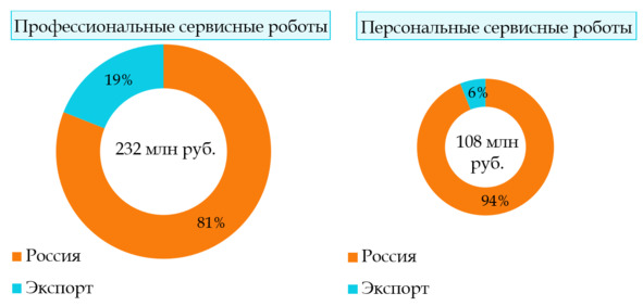 Российскими разработками широко интересуются за рубежом, что говорит о высоком экспортном потенциале отечественных робототехнических продуктов. Среди экспортеров роботов такие компании, как Promobot, AlfaRobotics, ROBBO, ExoAtlet, VIST Robotics. В 2017 году за рубеж всего было продано 303 робота на сумму 51 млн руб. В количественном выражении экспортируется 37% российских профессиональных сервисных роботов и 18% персональных сервисных роботов (табл. 1).