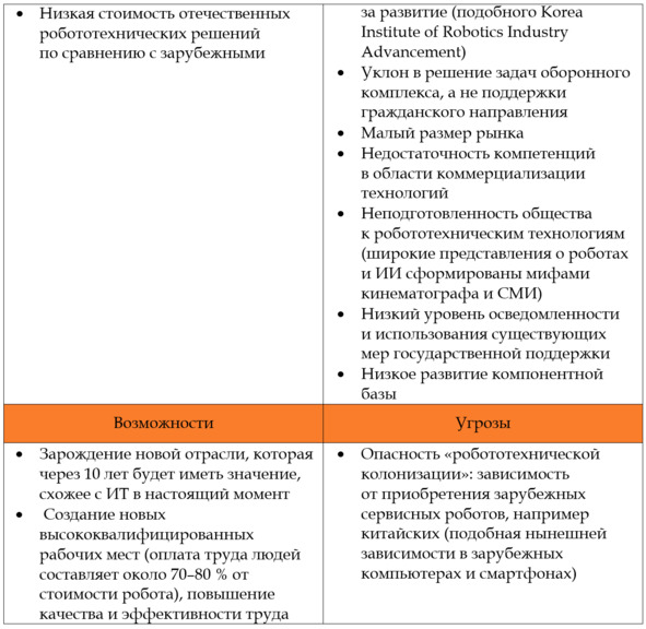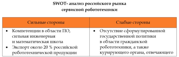 На основании данных, собранных НАУРР о российском рынке сервисной робототехники, был проведен SWOT-анализ рынка. Были выделены сильные и слабые стороны рынка, проанализированы возможности его развития, а также риски.
