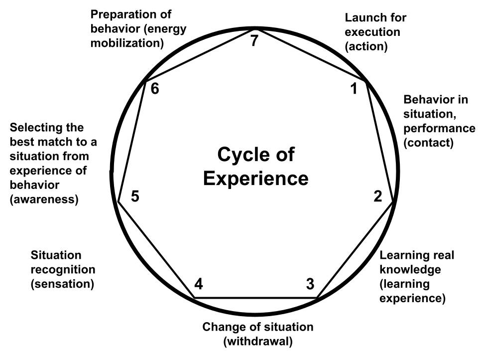 Engineer: Action in the moment must correspond to the moment of the situation. At the same time, any situation is not a single moment, but a sequence of events that can unfold over seconds, minutes, or even years. Tying shoelaces, a concert, or a hundred-year war. But each time, con-sciousness outpaces time, prepares a scenario for behavior in accordance with the anticipated scenario of the situation and launches it in order to hit the beat. Did we hit the beat or not? Did we hit it everywhere or partially? Do we need to change our behavior because we can do better in this situation, or perhaps because the situation has changed? Consultant, thank you! The cycle of experience is a most powerful tool for the analysis and synthesis of behavior!