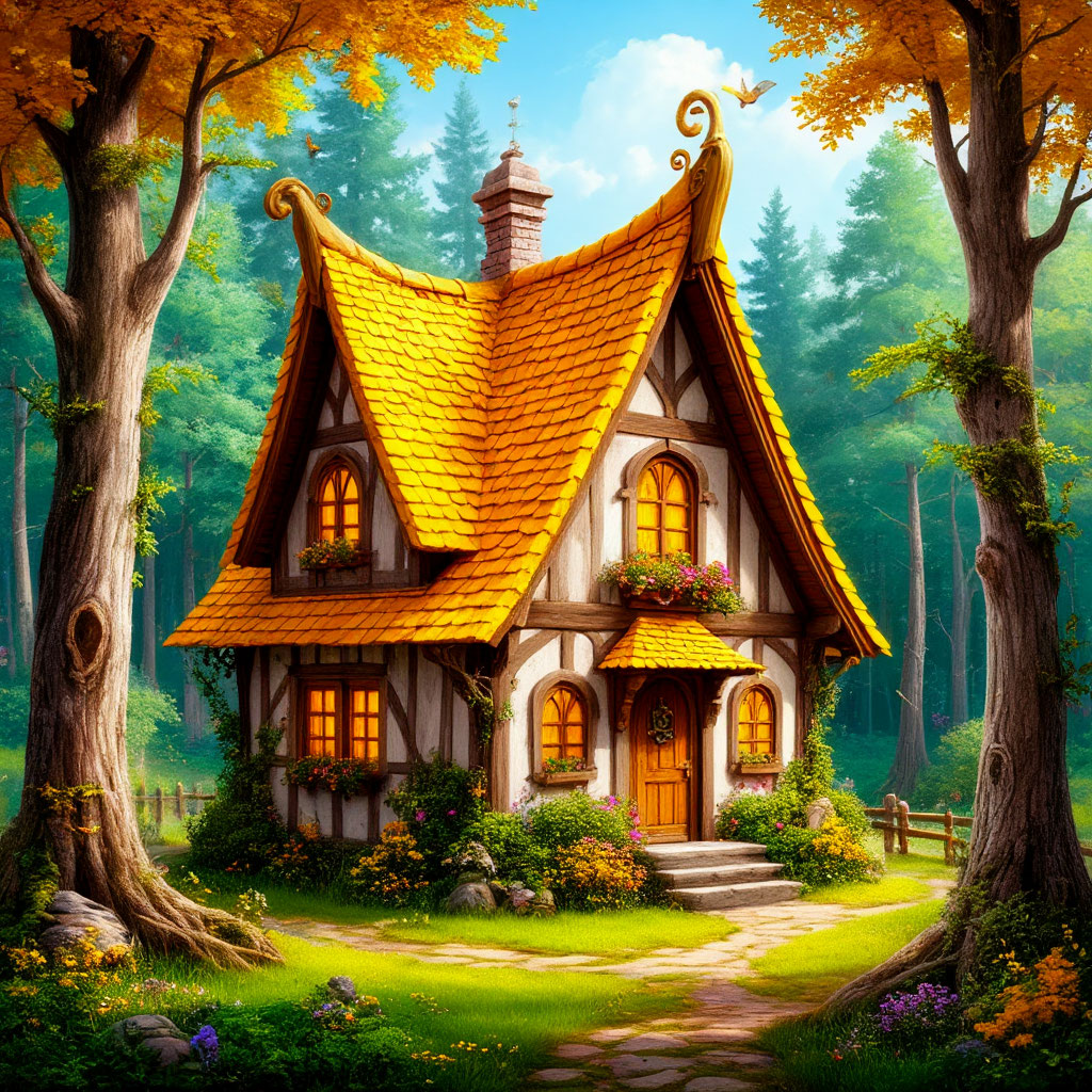 Прямо за малиновой рощей, посреди солнечной полянки стоит дом. Тёплый, уютный дом из брёвен, с жёлтой крышей и расписными окнами.