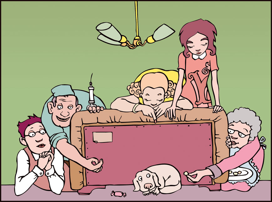 Доктор уронил шприц с прививкой, а затем, окончательно потеряв равновесие, сел на Мамин любимый цветок. Бабушка грудью надежно прикрывала дрожащего Казю и Машу со спущенными штанами, прибежавшую на шум.