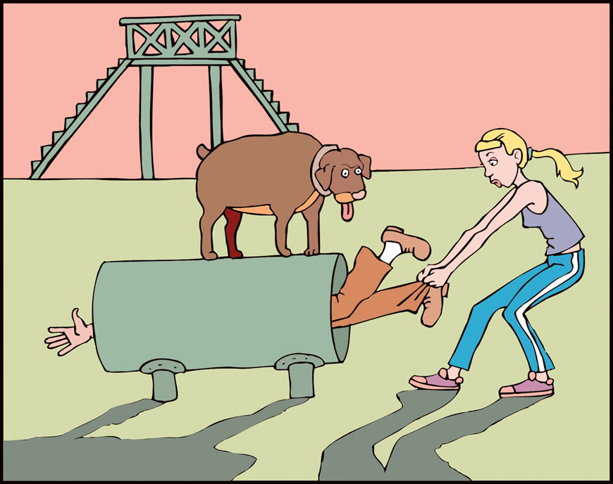 Следующие десять минут напоминали центральную сцену из фильма про тюремные будни или разгул дедовщины в армии. Хрупкое создание рычало так, как никакому сержанту или вору в законе и не снилось. От грома команд с окрестных деревьев сыпалась листва и вполне дееспособные вороны. Ротвейлер трясся, как осиновый лист. Его хозяин, понукаемый инструкторшей, в качестве примера для несчастной собаки сам прыгал через барьеры, два раза сверзился с довольно-таки высокой лестницы и, наконец, плотно застрял в трубе.
