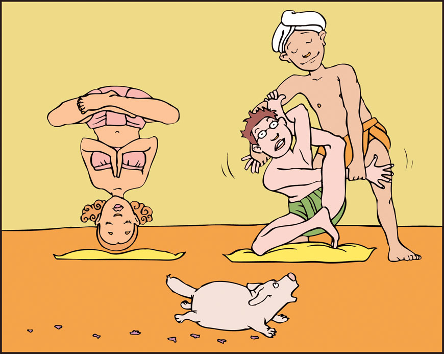 Потом он смотрел на Папу в позе «уджасная-распиндасана». Вид у Папы, надо сказать, соответствовал названию позиции. Просто вылитый шарпей – вся кожа, начиная с места чуть ниже спины, съехала к шее. При этом глаза вылезли из орбит, как у вареного рака, а ручки с ножками образовывали фигуру Лиссажу (см. математическую энциклопедию) или еще чего похуже.
