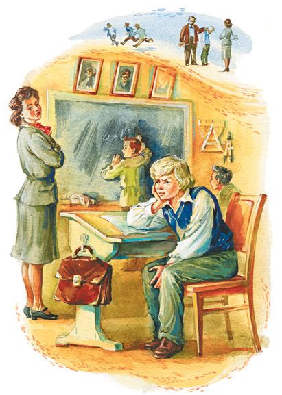 Жалко, что география была не перед уроком рисования. Я бы тогда лучше нарисовал. Я нарисовал бы глаза ребят. Правда, когда того ученика наказывали розгами, ребята смотрели по-другому. Сейчас в их глазах мечтательное выражение, а тогда был ужас.