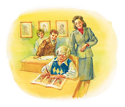 А у учительницы светлые волосы и добрая улыбка. Она посмотрела мне в глаза и говорит: