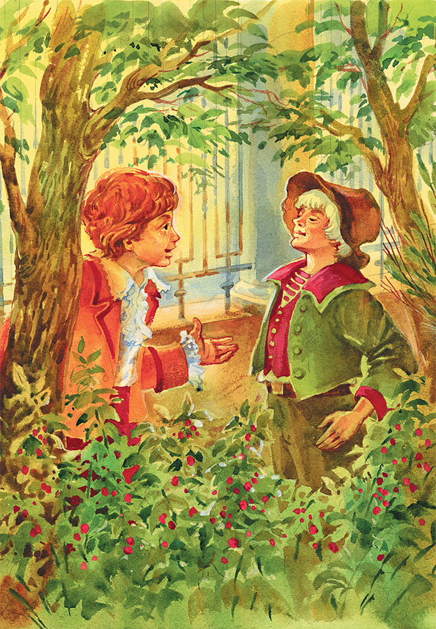 Король со своим новым другом юркнули в густой малинник, росший вдоль ограды, чтобы без помех решить, как им быть дальше.