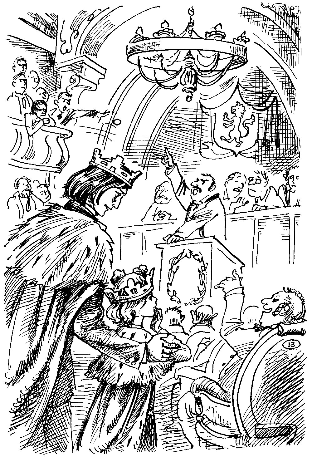 Парламент помещался в большом красивом здании, внутри оно напоминало не то храм, не то театр. На возвышении за столом разместились какие-то важные господа, как у Матиуша во дворце во время заседаний. Но тут в зале стояло ещё много-много кресел, на которых сидели мужчины. Они выходили на трибуну и произносили длинные речи. По бокам были ложи, а в ложах – министры. В стороне за большим столом примостились корреспонденты, которые писали в газеты о том, что слышали и видели в парламенте. На галёрке было полным-полно народу. Когда Матиуш с Печальным королём вошли в зал, оратор обвинял в чём-то министров.