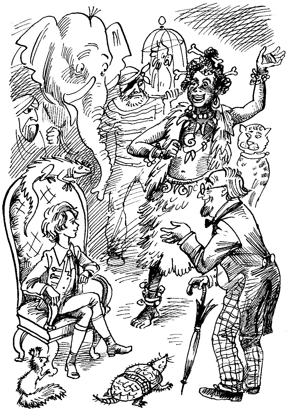Среди торговцев дикими зверями был один настоящий индеец и два негра. Однако одеты они были по-европейски и говорили понятно, потому что жили попеременно то в Европе, то в Африке.