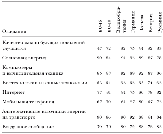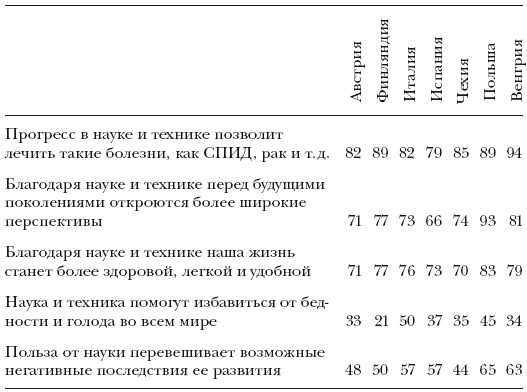 Первый вопрос, который мы должны рассмотреть, касается оценки технического прогресса. Действительно ли прошлые и будущие изобретения, инновации, новые продукты и технологии воспринимаются как движение вперед, или же люди считают их вредными или опасными? Данный вопрос фигурировал в ряде международных опросов; табл. 9 и 10 позволяют ознакомиться с любопытными результатами. В отношении пользы и вреда от технического прогресса две трети респондентов из Польши и Венгрии считают, что положительный эффект сильнее отрицательного. С этой точки зрения в упомянутых двух постсоциалистических странах идею технического прогресса поддерживает больший процент населения, нежели в Австрии, Финляндии, Италии, Испании и постсоциалистической Чехии. Когда речь заходит о будущем, в поддержку технического развития высказывается еще больший процент респондентов (см. пятый столбец в табл. 1–9 и первый столбец в табл. 1-10).