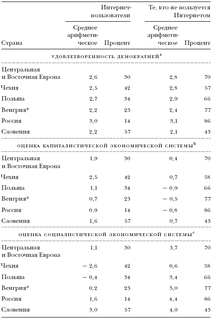 ПРИМЕЧАНИЕ. Респонденты отвечали на вопросы: а «Насколько вы удовлетворены тем, как работает демократия}» Ответы давались по шкале в 4 балла: 1 = полностью удовлетворен (а); 2 = удовлетворен (а) до некоторой степени; 3 = не очень удовлетворен (а); 4 = совершенно не удовлетворен(а). ь «Насколько вас устраивает капиталистическая система}» Ответы давались по шкале в 21 балл: от -10 = совершенно не устраивает; 2 = нейтральное отношение; +10 = полностью устраивает. с «Насколько вас устраивает социалистическая система?» Ответы давались по шкале в 21 балл: от -10 = совершенно не устраивает; 2 = нейтральное отношение; +10 = полностью устраивает. В таблице отражено среднее арифметическое (невзвешенное).