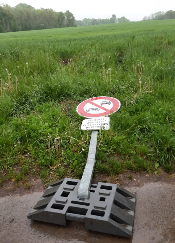Знак повержен! В который раз? Неужели у кого-то хватит настойчивости, времени и средств выправлять каждый раз этот знак и выставлять его посреди дорожки?!? С каждым таким разом шансов всё меньше и меньше…
