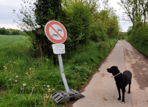 Опять многострадальный дорожный запрещающий знак «приподняли» и поставили почти изгибисто-вертикально у дороги… Наш сОбак с удивлением смотрит на него:
