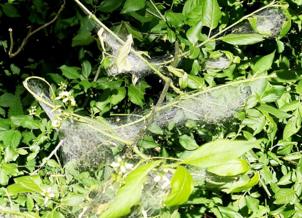 Очередная напасть… Как-то прошлым летом её было не так заметно, как позапрошлым. От климата и температуры зависит… Это не паутина. Это гусеницы себе такие «коконы» обустраивают… А потом оттуда мириады выползают и расползаются по всей округе. А кто у них главный враг-истребитель? Птицы? Уже не верится, что птицы справятся с таким нашествием «грызунов» зелени…