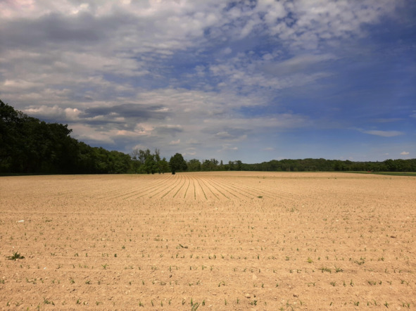 Вроде бы кукурузу посадили… Жара. Сушь… Но что-то там пробилось и тянется к небу… А по таким полям сейчас зайцы бегают-прыгают. Наш сОбак регулярно кого-то там гоняет, хотя всегда и безуспешно…