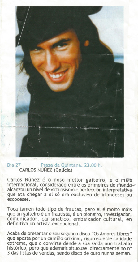 Я же скромненько так сходил в 93-ем в Сантьяго за символическую денюжку на потрясающий концерт гитариста Джона Маклохлина, на бесплатное душевнейшее выступление кубинца Паблито Миланеса, а через пару дней и на ночной концерт «Старой Тровы из Сантьяго [который на Кубе]» (когда ещё они не стали такими известными, как и триумфально покорившие весь мир «старички» -кубинцы Buenavista Social Club с лёгкой руки Рая Кудера, «открывшего» их на Кубе в самом конце ХХ века в 1997-ом, когда им было уже хорошо за 65+…) и, конечно, «заболел» галисийской волынкой в руках и устах Карлоса Нуньеса вместе с ирландцами из Чифтайнс (The Chieftains). Тогда же впервые увидел рыжеволосую длинноногую ирландку Джин Батлер (Jean Butler), которая зажигательно танцевала на сцене в Сантьяго под кельтскую музыку Чифтайнс с Нуньесом… Там тогда она была на «подтанцовке»… Это потом, уже в Шотландии увидел её в первых версиях концерта «Риверданс» примой в паре с Мишей (Майклом) Флэтли… Это потом, в Глазго, в 96—97 ходил на концерты Карлоса Нуньеса на Кельтском фестивале и опять слушал его в Сантьяго в 99-ом 27 июля широко раскрытыми ушами, стоя у самой сцены… (А чтобы «застолбить» местечко у той сцены пришёл на площадь очень заранее = вход был свободный! И «поздно пришедшим = не кости, а самые задние ряды…)