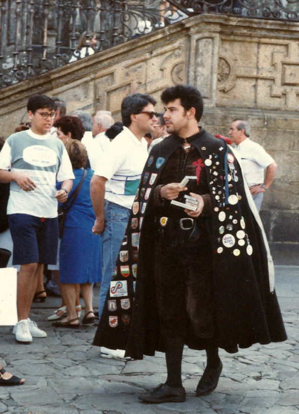 «Современный» (конец ХХ века) сантьягский «тунец» -93перед Собором толкает кассеты(тогда ещё кассеты были!)и компакты с записями своей родной «туны»…Когда появились тунцы и туна в Испании?