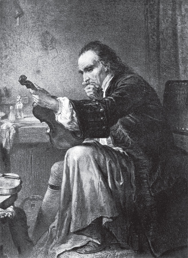 Козио показал маленькому Паганини старинный портрет Страдивари с тремя сыновьями и дочерью. Страдивари был изображен в мастерской. Он стоял в белом замшевом фартуке и в красном сафьяновом колпаке и держал кусок дерева и инструменты.