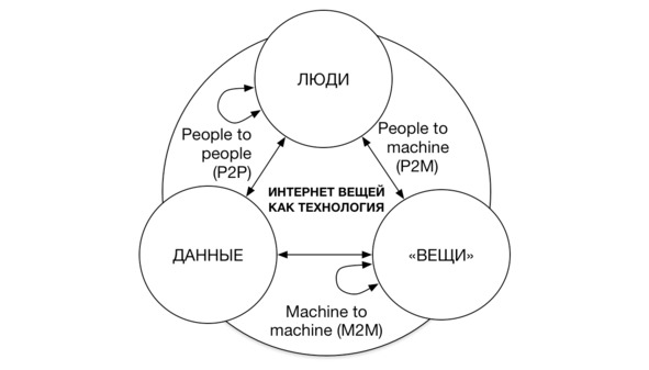 По сути, физические устройства становятся лишь «аватарами» своих виртуальных сущностей, живущих своей бурной жизнью в виртуальном информационном мире. «Интернет вещей» – это не просто «вещи, подключенные к интернету»: как до последнего времени интернет был преимущественно средством общения и обмена информацией между людьми («интернет людей»), так сейчас он становится средой и технологией взаимодействия «вещей», как физических, так и виртуальных.