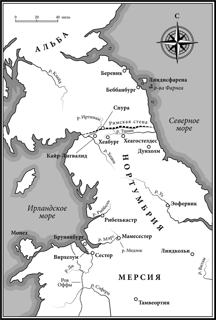 Без сомнения, у читателей есть свои любимые варианты в том списке, который я привожу ниже. Но я принимаю написание, предложенное «Оксфордским» или «Кембриджским словарем английских географических названий» для эпохи ближайшей или включающей время правления Альфреда – 871–899 годы н. э. Но даже такое решение не гарантирует от ошибок. Название острова Хайлинга в 956 году писалось и «Хейлинсиге», и «Хаэглингейгге». Сам я тоже не был слишком последователен, используя современную форму «Нортумбрия» вместо «Нортхюмбралонд», тем самым избегая намека на то, что границы древнего королевства могли совпадать с границами современного графства.