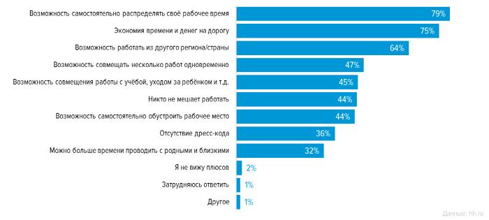 Сотрудникам удаленная работа также дает целый ряд выгод. Согласно опросу, который проводил HeadHunter, ключевыми преимуществами сотрудники называют гибкий график, экономию времени и денег на дорогу, а также возможность работать из любой точки мира.