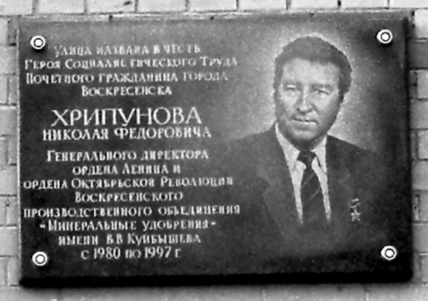 Хрипунов Николай Фёдорович пользовался огромной любовью и большим уважением воскресенцев. С большой торжественностью отметили его 60-летний юбилей во Дворце культуры «Химик». Буквально до отказа зрительный зал был заполнен людьми. Много было произнесено сердечных поздравлений и добрых слов в адрес юбиляра. И все годы, которые он прожил, его тепло и приветливо встречали химики и городские жители на улицах города. Следует отметить также ощутимую поддержку со стороны управляющей компании «Роспром», в которую вошёл химкомбинат, в период болезни Хрипунова Её руководитель Гурьев Андрей Григорьевич оказался порядочным человеком и высокого морального долга и многое сделал для оказания всяческой помощи больному директору. Он не забывал о нём до самого последнего дня жизни, поддерживал морально и материально. Часто навещал его дома, приглашал на все торжественные мероприятия, что позволяло больному лучше себя чувствовать и приобретать необходимую уверенность, быть не забытым и покинутым со стороны своих сослуживцев. За восемь с лишним лет у Николая Фёдоровича произошли позитивные сдвиги по улучшению здоровья, но всё же 26 мая 2005 года внезапно остановилось сердце. В день похорон с ним проститься вышло много народу.