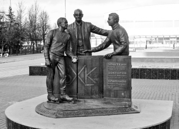 Вот почему народ воздал ему высокие человеческие почести: одну из новых улиц назвал его именем, на вновь построенном жилом доме установлена мемориальная доска, и перед Дворцом спорта сооружён скульптурный памятник организаторам воскресенского хоккея – Эпштейну, Хрипунову и Докторову.