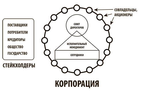 На рисунке 1 схематично изображена компания с распыленным владением, окруженная своими акционерами (на границе по кругу) и прочими стейкхолдерами (вне границы). В фокусе нашего внимания, в центре схемы, находится компания с ее органами управления (советом директоров и менеджментом), а не акционеры и не стейкхолдеры.
